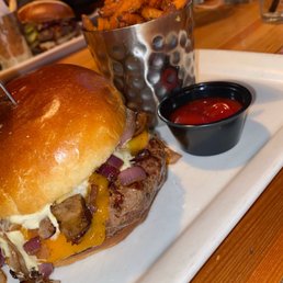 Burgers are good! Sweet potato fries are nice and crispy - not too crispy. They have a lot of burgers to choose from so just take your pick. I had the Demi-god without the relish and it was very good. It was very full, so you may need to wait a minute to find a seat. But the food came out pretty quick. Their thin cut fries are actually very normal cut, too. I'll be coming back.